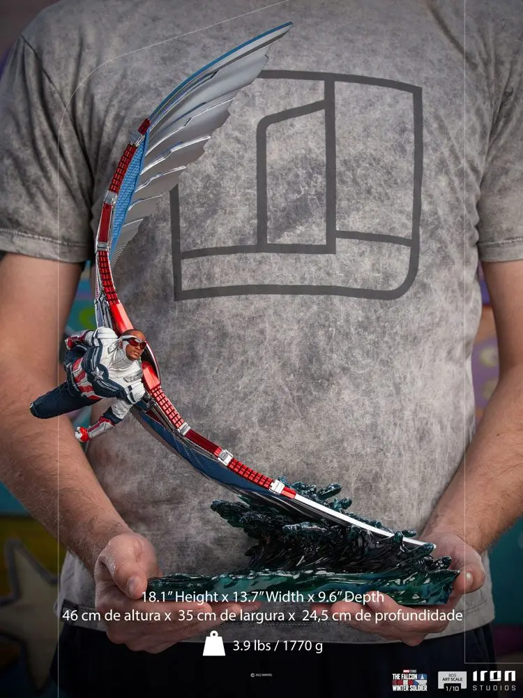 On a base that resembles the Hudson River, cutting through the waters with one of its mighty mechanical wings, the new winged Sentinel of Liberty uses all of its enhanced maneuverability and agility skills, as an actual bird of prey, with its new outfit with stars and stripes in the colors of his country's flag, carrying on his back the legendary shield of his predecessor. He flies at high speeds over New York City on a mission to rescue the victims of the terrorist and anti-nationalist group known as Flag Smashers. Inspired by the "One World, One People", the sixth and final episode of the first season of the miniseries "The Falcon and the Winter Soldier" on the Disney+ streaming channel, Iron Studios presents the statue "Captain America Sam Wilson Deluxe - The Falcon and the Winter Soldier - BDS Art Scale 1/10", with the hero, formerly called Falcon, taking on the name and legacy of the first avenger.A former military paratrooper trained in aerial combat, Sam Wilson, one of Steve Rogers' most loyal friends and allies, received Captain America's shield from Rogers at the end of Avengers: Endgame. After initially reluctant to assume such a legacy, the Avengers hero, known in the past as Falcon, in the season finale "The Falcon and the Winter Soldier", takes over as the new Captain America. With a new uniform and flight suit in a Vibranium version of EXO-7 created by Wakandan scientists at the Wakandan Design Group, Wilson flies to New York to face the onslaught of the Flag Smashers, with the help of his new ally and partner Bucky. Barnes. An expert fighter and tactician, he trained hard with Bucky's help to use the indestructible shield, which, together with his flying skills, made him a formidable combatant.